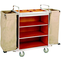 Information: Constructed from commercial grade wooden with easy-to-clean surfaces. The top of the cart includes a deep tray compartment to hold supplies securely in transit, 2 push handles, 2 vinyl collection bags allow the housekeeping cart to be used in either direction and one side includes provisions for towing a vacuum cleaner.